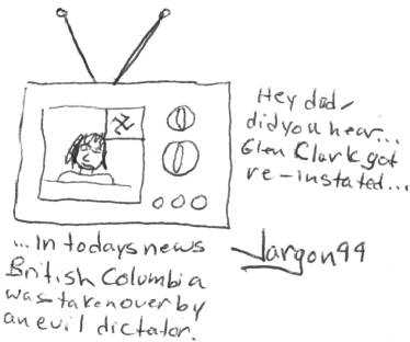 provincial oppression No, Glen Clark didn't really get re-instated in BC. I just liked making jokes about how back when he had a mustache, he kinda looked like Hitler. Not really, but if you looked closely...