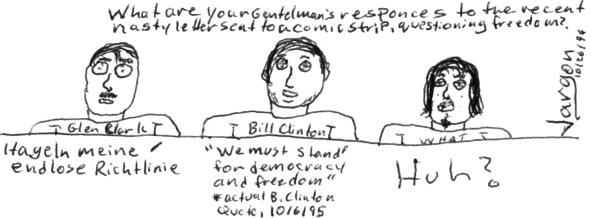 responces? Well, there be Glen Clark (speaking German, hmmm) and Bill Clinton. I had to use a real quote from the Pres. since the strip I'd been attacked over was about him. Quite appropriate really.
